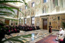 O Papa fez um discurso ao grupo, começando por agradecer sacerdotes, religiosos, religiosas, leigos e leigas por sua ajuda ao manter viva a obra de evangelização, paradigma de toda obra da Igreja.